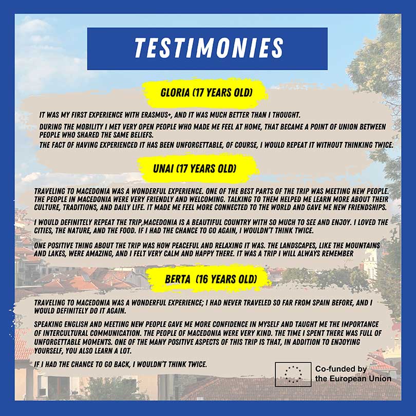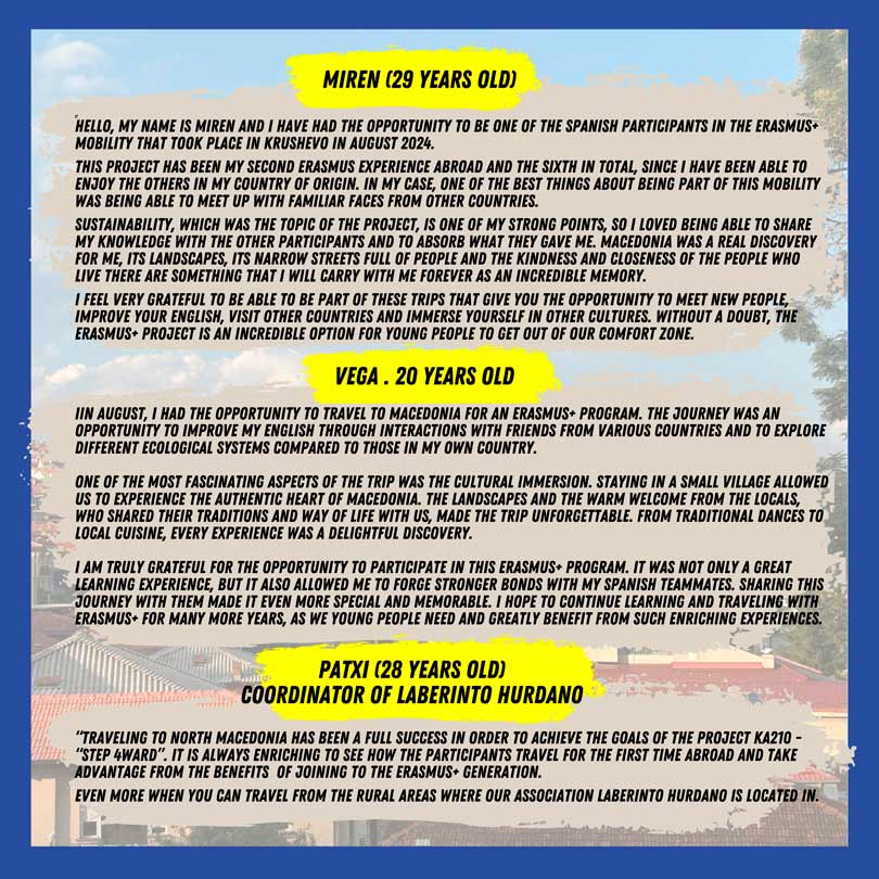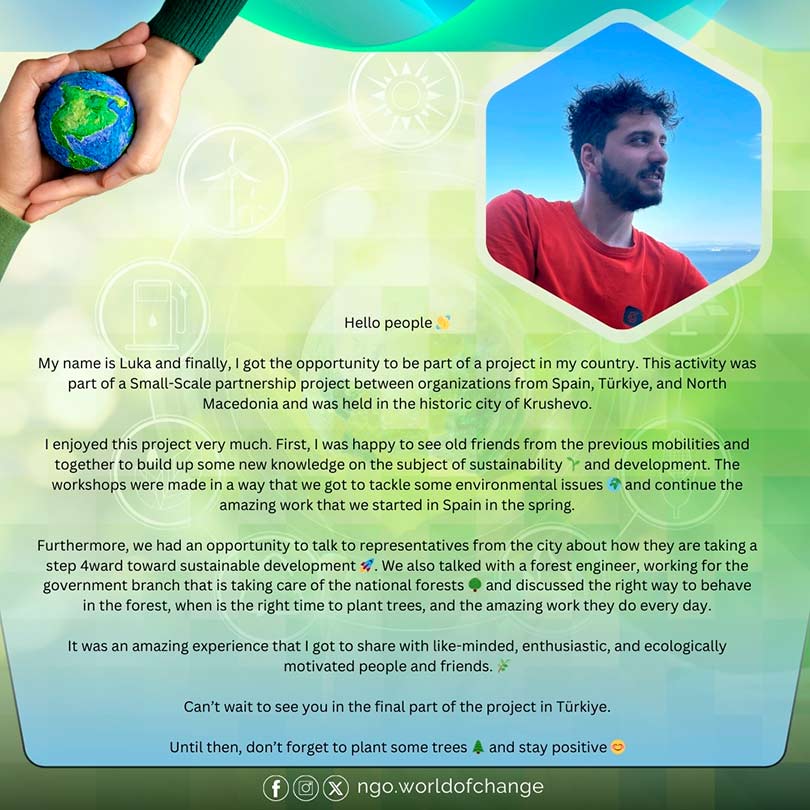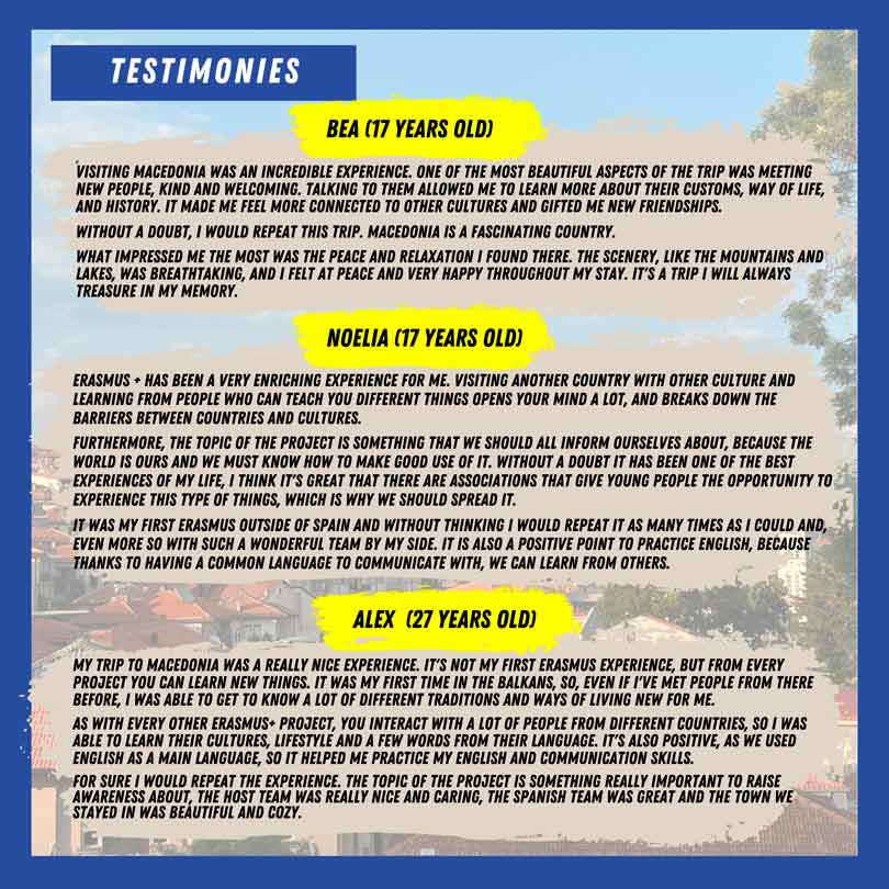 MOBILITY IN MACEDONIA Sustainability, Youth and Development II International Mobility made up of 30 people. Where ecological volunteering actions are carried out in North Macedonia for 7 days. Place of stimulation and creation of innovative solutions and ideas to promote the reduction of environmental impact. mobility in MACEDONIA DAY 1 mobility in MACEDONIA DAY 2 mobility in MACEDONIA DAY 3 mobility in MACEDONIA DAY 4 mobility in MACEDONIA DAY 5 GENERAL ANALYSIS LABERINTO HURDANO ANALYSIS MACEDONIAN ANALYSIS TURKISH ANALYSIS ANALYSIS of the MOBILITY IN MACEDONIA GENERAL ANALYSIS ANALySIS of the MOBILITY IN macedonia Laberinto Hurdano ANALYSIS of the MOBILITY IN MACEDONIA macedonian ANALYSIS ANALYSIS of the MOBILITY IN MACEDONIA tuRKISH ANALYSIS